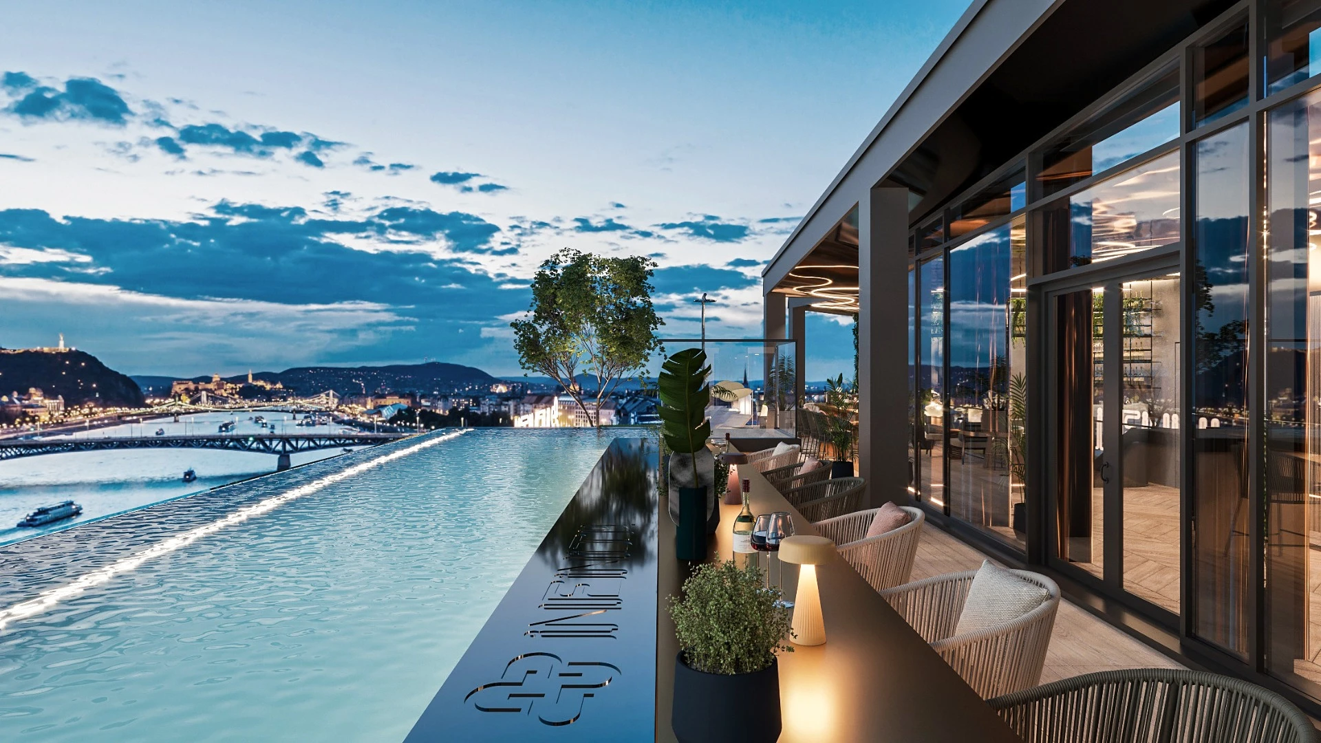 Floor: 10th Interior Area: 135.51 sqm Terraces: 14.8 sqm + 51.48 sqm Rooms: 1 living room + 3 bedrooms Bathrooms: 3 Situated on the 10th floor, Residence 1006 offers exceptional proportions and uninterrupted, eternal views over the Danube. Expansive interiors filled with natural light are complemented by two remarkable terraces totaling more than 66 sqm, seamlessly blending refined indoor living with breathtaking outdoor scenery — creating a true penthouse lifestyle experience in the heart of the city. This residence is an ideal choice for private ownership, while also representing an outstanding investment opportunity in a prime location. The Building – A Complete Luxury Experience The 12-story development is designed to deliver an uncompromising lifestyle: Ground Floor: Restaurant, café, and beauty salon 1st Floor: Exclusive spa, wellness, and fitness facilities Floors 2–5: Apartment hotel Floors 6–11: Private residential levels Rooftop: A spectacular Sky Bar with an infinity pool, where water meets the horizon in a striking visual illusion A three-level underground garage provides 99 parking spaces, with optional electric vehicle charging installation available. A private parking space may be purchased with the residence, ensuring comfort and discretion. Vision and Lifestyle Designed to exceed traditional residential standards, the building provides an ideal setting for business meetings, private events, and serene relaxation alike. The developers have embraced innovative architectural solutions with sustainability at the forefront, shaping forward-thinking living spaces that redefine contemporary urban luxury.